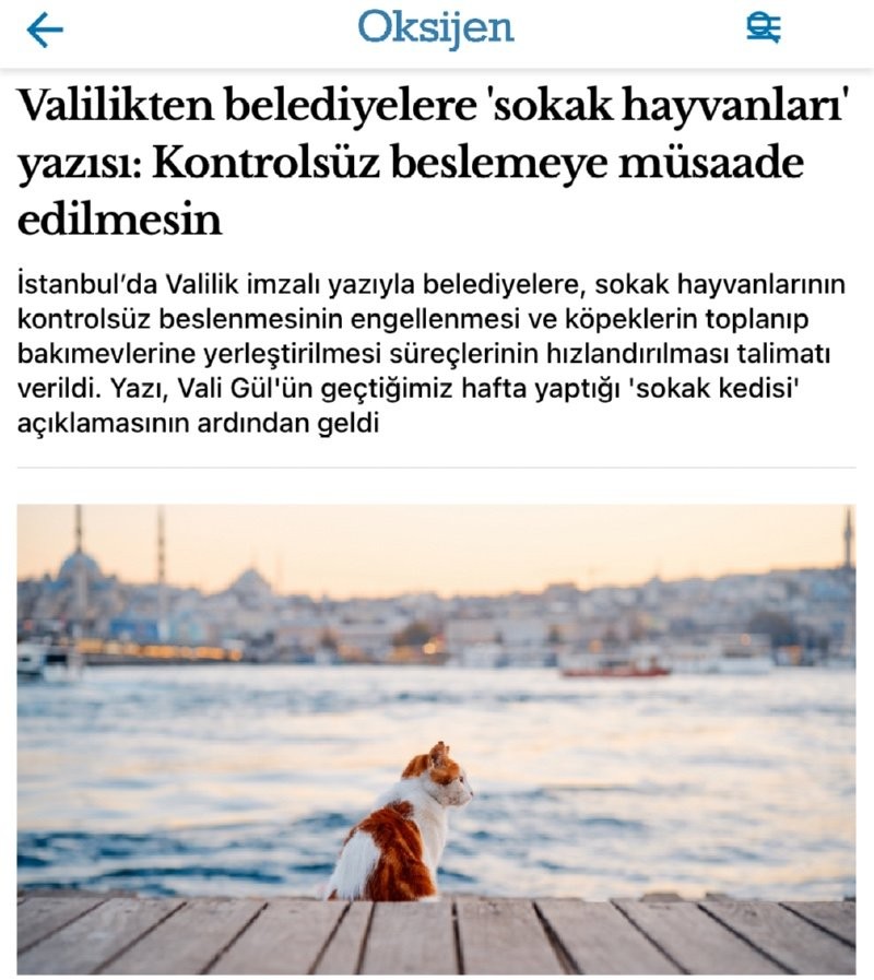 지난주 이스탄불 주지사 다부트 귈은 에콜 TV 생방송에 출연해 지자체들에게 "만약 이 동물들을 수거하지 않아 누군가 다치게 되면 형사 책임을 져야 할 것"이라고 경고했습니다. 그는 또한 어디에서나 고양이에게 먹이를 주는 행태를 비판했습니다. 그의 비판은 소셜 미디어에서 거센 반발을 불러일으켰습니다.