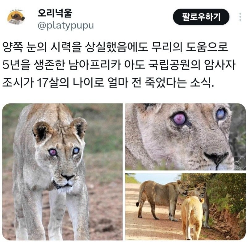 시력을 잃고도 천수를 누리다 죽은 야생 사자.jpg