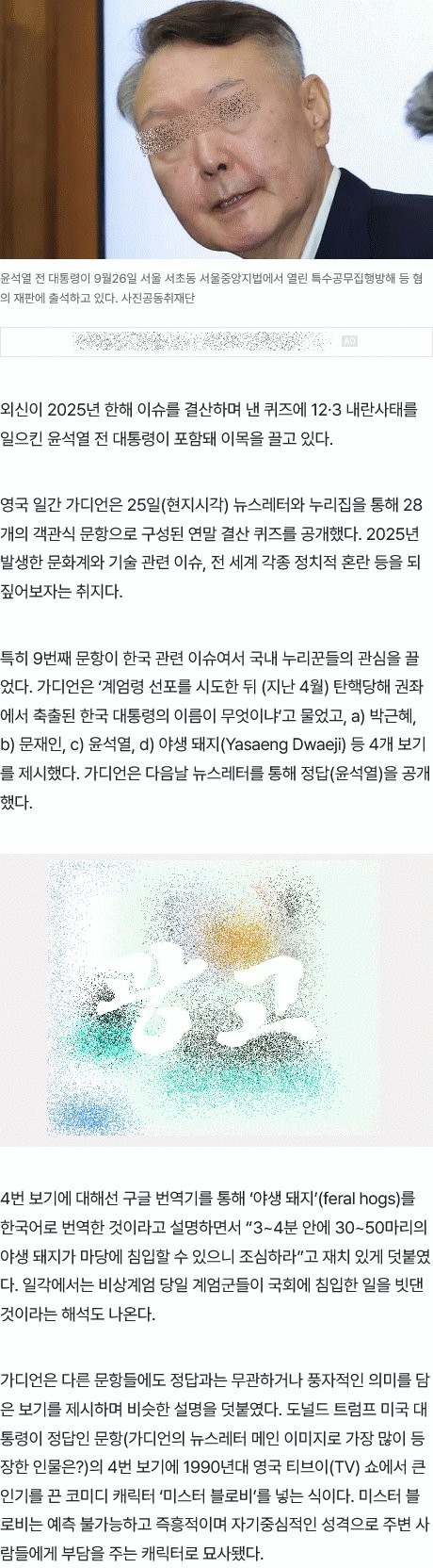 가디언 연말 퀴즈쇼에 “계엄 뒤 축출된 한국 대통령은?”…보기에 야생돼지