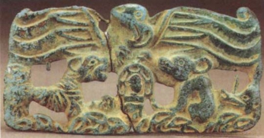 17681796362774.jpg요령성 평강지구에서 출토된 ‘새’ 토템족이 ‘곰’ 토템족, ‘범’ 토템족, ‘이리’ 토템족을 휘하에 거느린 동안의 청동장식.