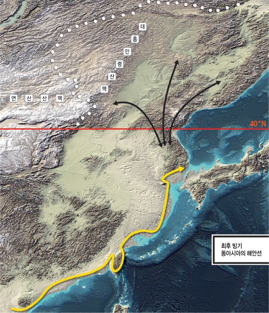 동아시아에서도 최후 빙기에 북위 40도 이북 지역에서는 인류가 상주(常住)하지 못했다. 물론 여름에는 사냥감을 뒤쫓아 북위 40도 이북에서 사냥하면서 계절적 일시 거주는 했다. 그러나 북위 40도 이북에 집단 상주지를 형성하고 문명을 만들지는 못했다. 동아시아의 북위 40도선은 한반도 신의주와 중국 베이징(北京)을 지나간다. 그러므로 고한반도의 압록강 최하류와 고중국의 베이징 이북은 최후 빙기 약 4만 년 넘게 인류가 상주할 수 없는 얼어붙은 동토였다. 그러므로 한국민족이 시베리아 고(古)아시아족에서 기원했다거나, 톈산산맥 또는 바이칼 호수에서 기원해 내려왔다는 학설은 기후변화를 모르던 시절의 낡은 학설에 불과하다.