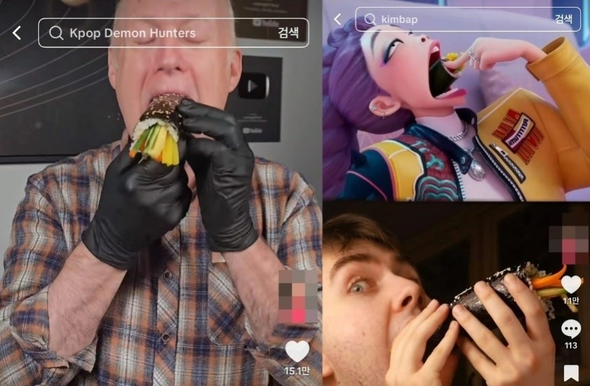 지난해 폭발적인 인기를 끈 애니메이션 케이팝데몬헌터스(우측 상단)에서 김밥을 먹는 장면이 나오며 SNS에 ‘김밥 먹기 챌린지’가 유행으로 번진 바 있다.