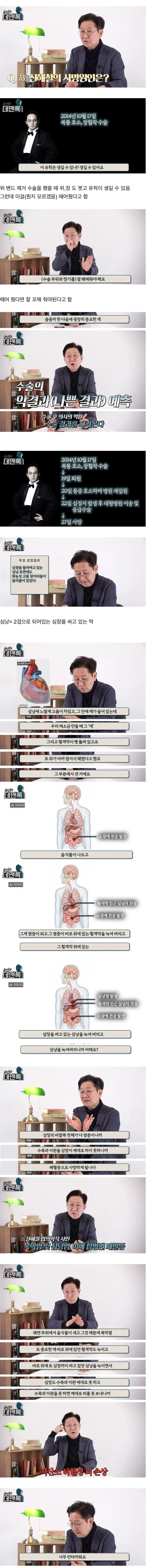 영상을 보면... 좀 복잡한데 위밴드 제거 수술을 할 때 사전 동의하지 않은 담낭제거한 것도 있고, 수술 후 본문에 나오는 '(누가 해도 완벽하지 않을 수 있기에) 금식하며 수술 경과를 지켜보'아야 할 기간에 환자의 방송 스케줄상 외출 및 식사를 했고 (병원은 허용하지 않았다고, 가족은 허용했다고 주장) ...