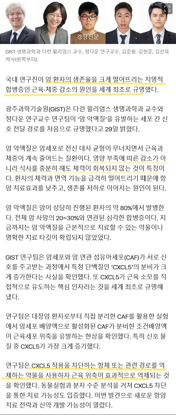 암 환자에 치명 ‘근육·체중 감소’ 원인 밝혔다…GIST연구팀 세계 최초