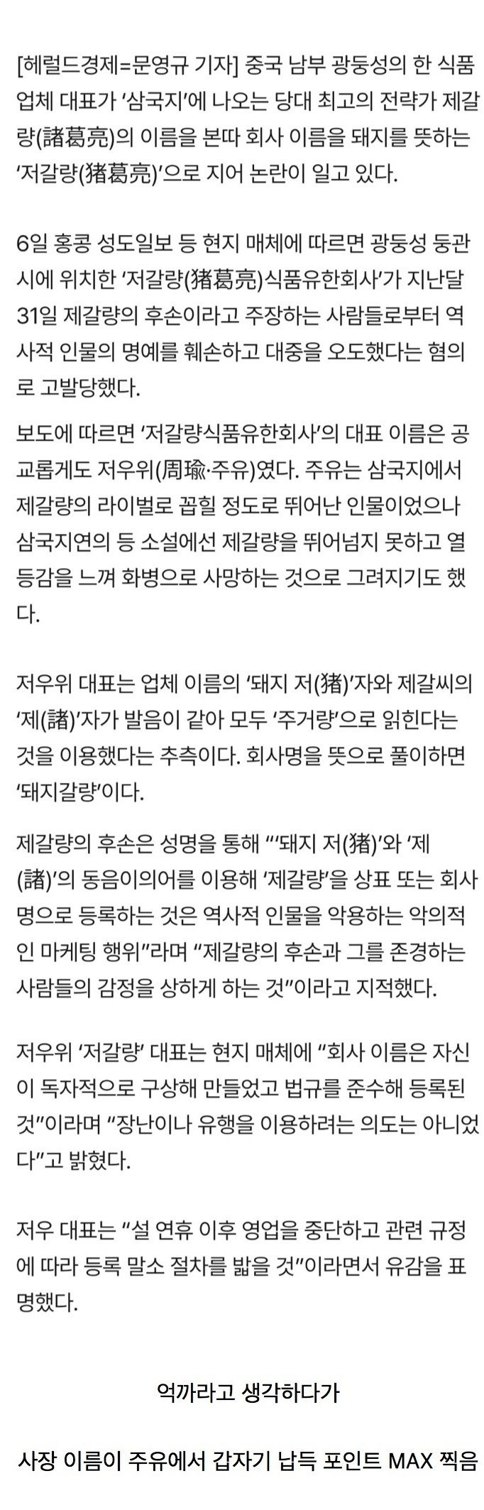 회사 이름을 “저갈량”이라고 지어 논란.jpg