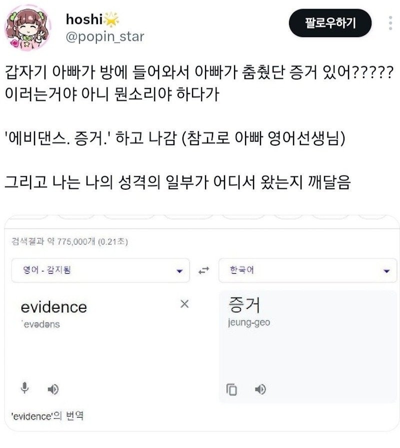 아빠가 갑자기 방에 들어와서 하는 말이 내가 춤췄단 증거 있어 ?????? 이러는거야