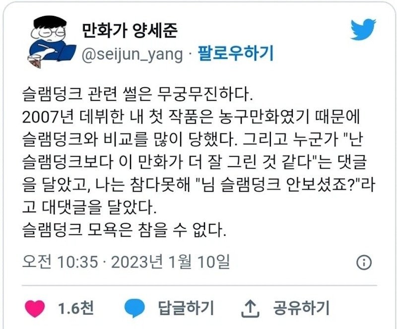 자신의 농구만화가 슬램덩크보다 낫다는 말을 들은 작가