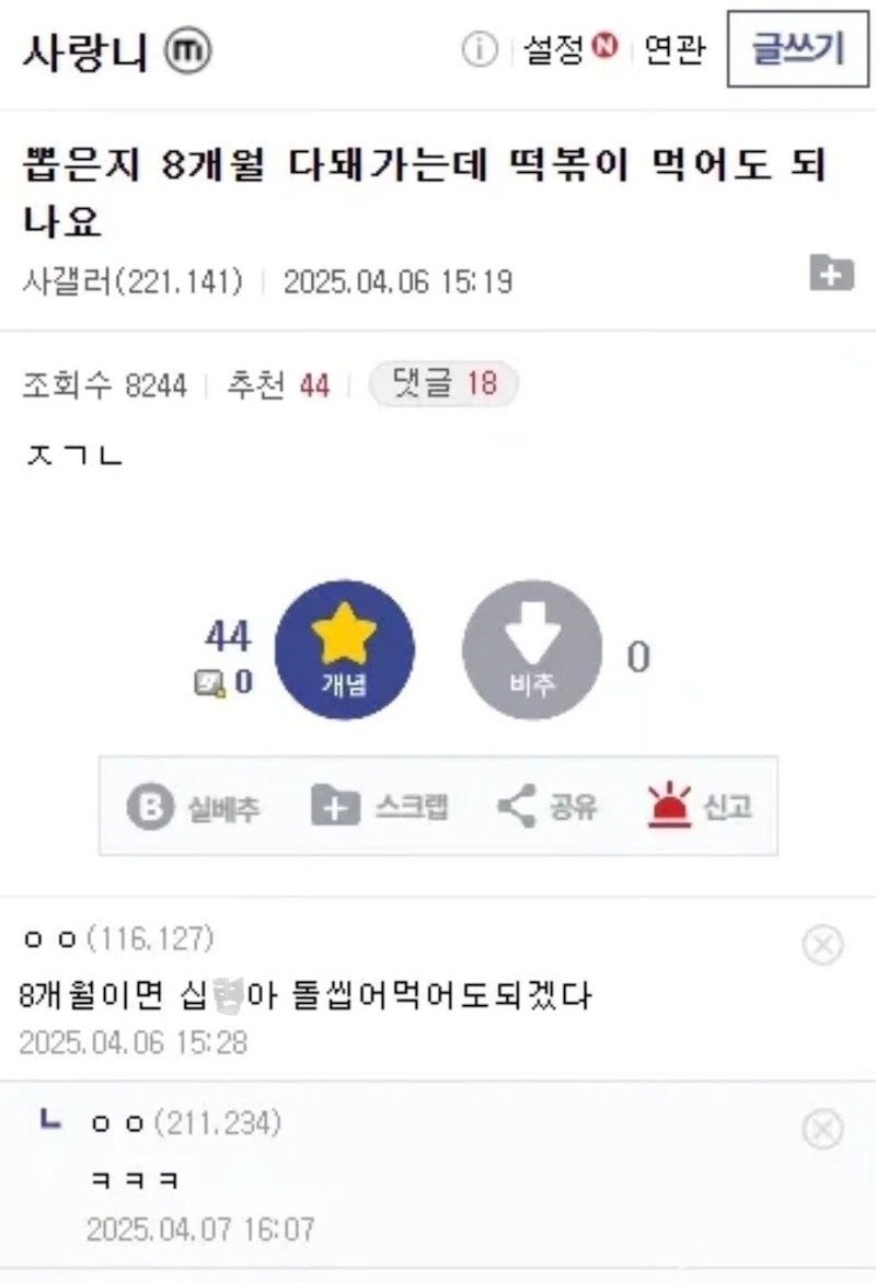 사랑니 뽑은지 8개월 됐는데 떡볶이 먹어도 되냐는 사람