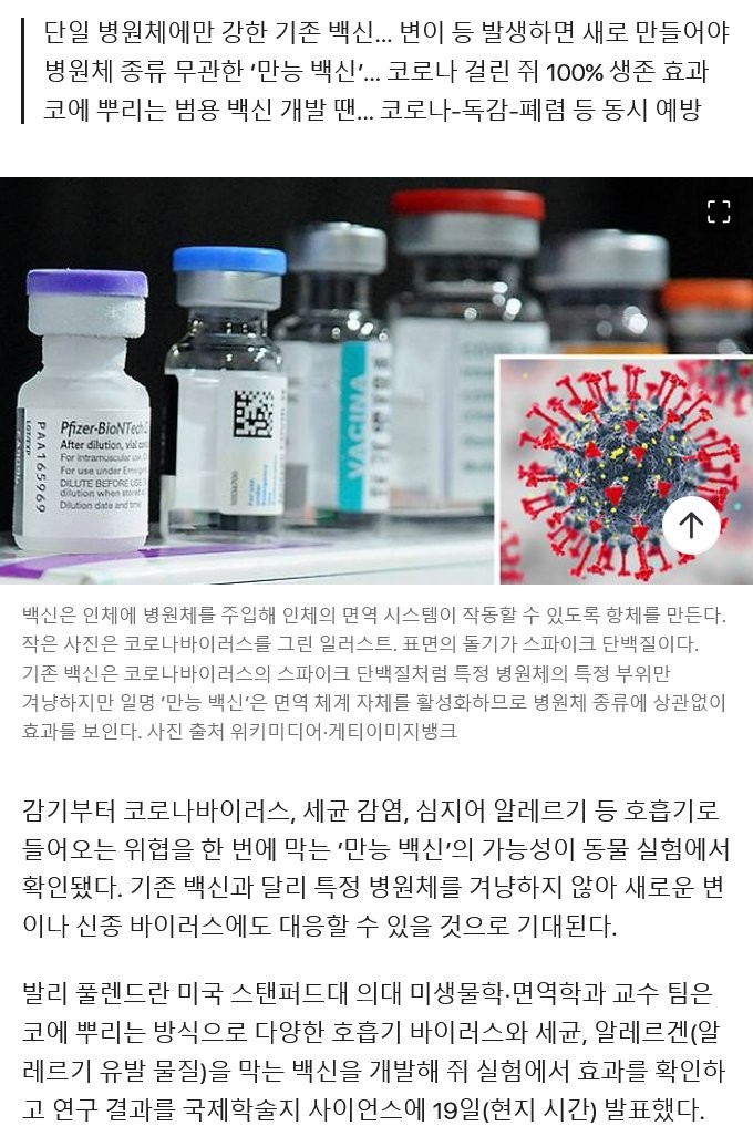 동물실험서 ‘만능 백신’ 성공… 코에 뿌리면 코로나-독감 예방