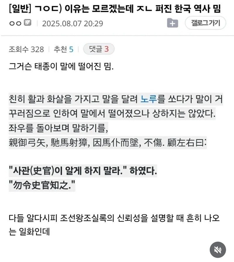근데 당시가 조선 초기라서 사관들이 어디까지 선을 넘지 말아야 할지 넘어야 할 지 정립이 안된 때라 저런 일이 있었지 조선 중기 정도만 되어도 저런 해프닝을 기대하기 힘들었다고도 들었습니다