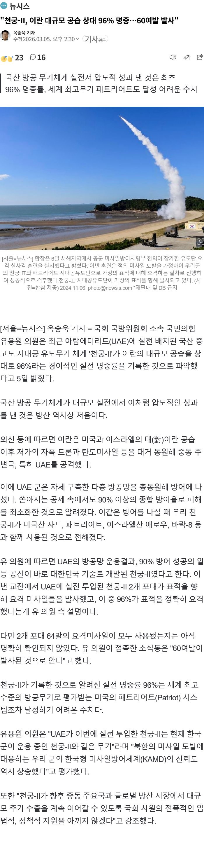 "천궁-II, 이란 대규모 공습 상대 96% 명중…60여발 발사"