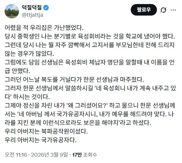 국가유공자 육성회비 납부 관련해서 세대마다 경험들이 다른가봐요 이어지는 트윗 퍼옵니다.