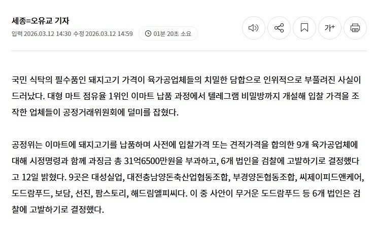 텔레그램 방에서 이마트 납품 삼겹살 가격 담합