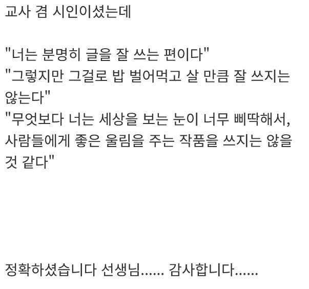 원래는 작가가 되고 싶었었는데 고등학교 은사님께서 팩폭으로 내 꿈을 식물인간 만드셨지