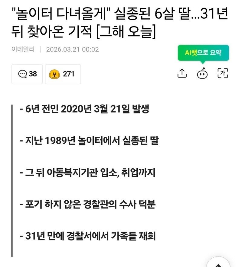 "놀이터 다녀올게" 실종된 6살 딸…31년 뒤 찾아온 기적 [그해 오늘]
