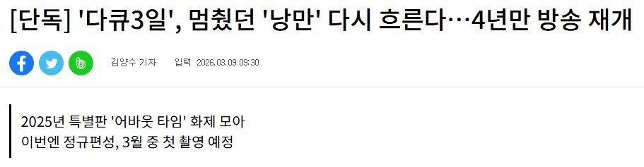 다큐3일, 멈췄던 '낭만' 다시 흐른다... 4년 만 방송 재개.news