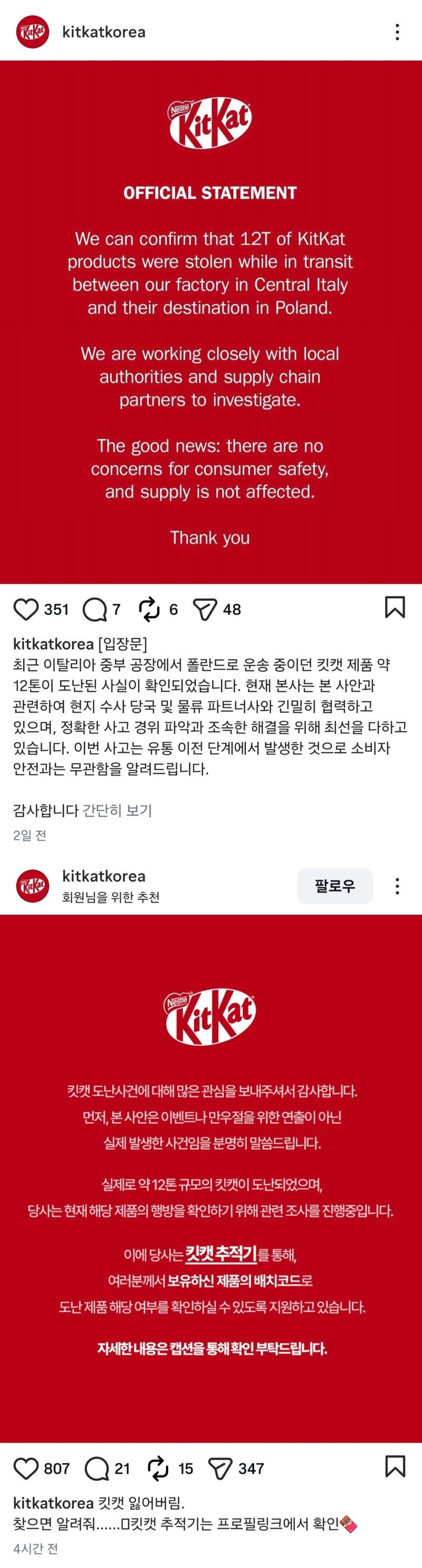 킷켓 121톤 도난 당했지만 위험하지 않은 상품이니 다행이죠.