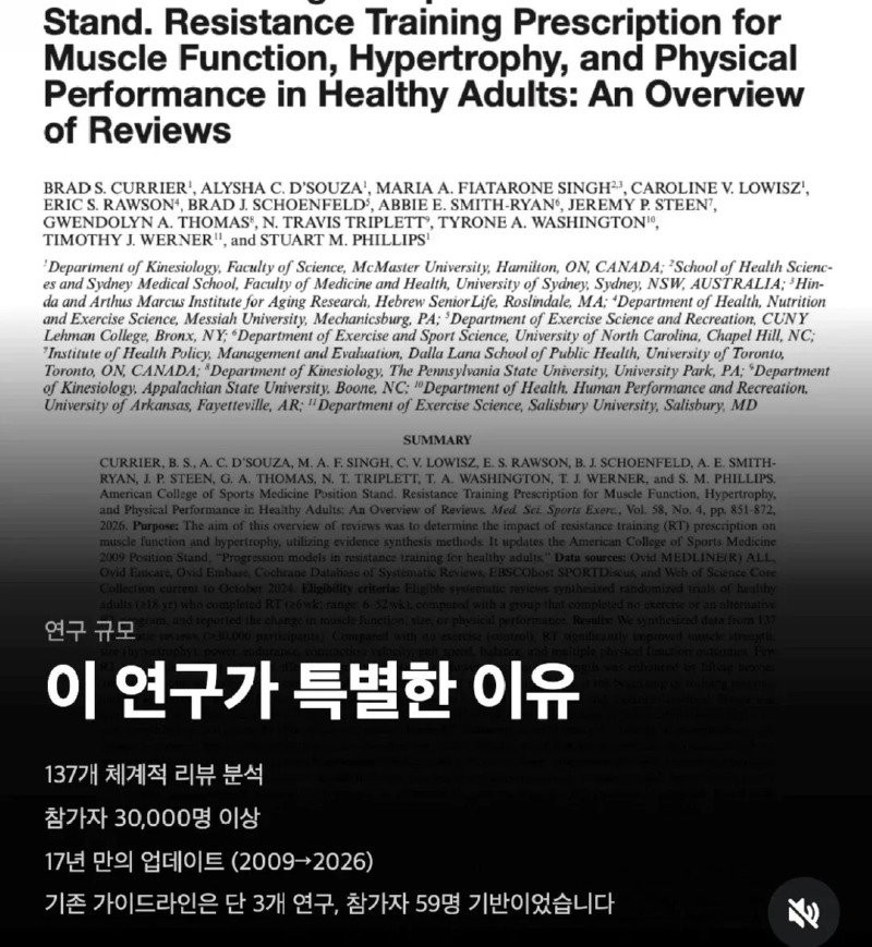 (논문제목이 잘렸었네요: American College of Sports Medicine Position Stand. Resistance Training Prescription for Muscle Function, Hypertrophy, and Physical Performance in Healthy Adults: An Overview of Reviews  입니다)