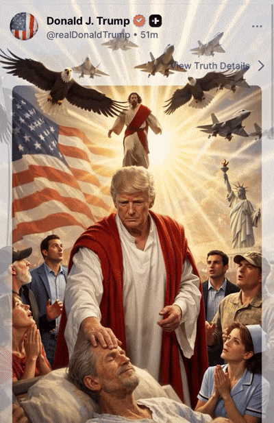 (서울=뉴스1) 이정환 기자 = 도널드 트럼프 미국 대통령이 공유한 '예수 행세' 인공지능(AI) 생성 그림이 논란이 되면서 미국 내에서 패러디가 이어지고 있다.