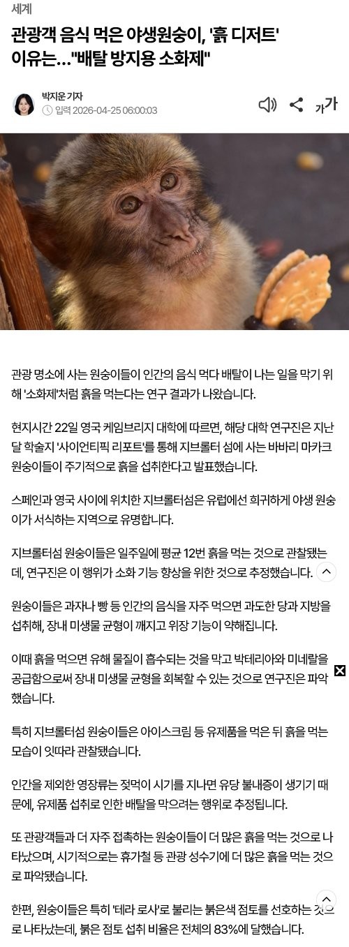 관광객 음식 먹은 야생원숭이, '흙 디저트' 이유는…