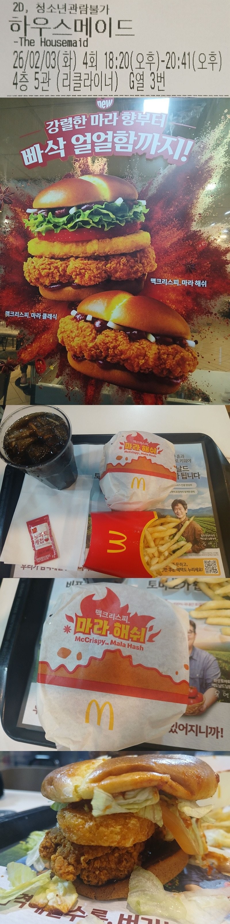 행동에는 결과가 따르는거야랄까...관람후 근처 맥날가서 신메뉴 맥크리스피 마라 해쉬 버거를 먹었습니다흠... 야채가 떨어지고 맛도 이상한 맛... 전 별로네요
