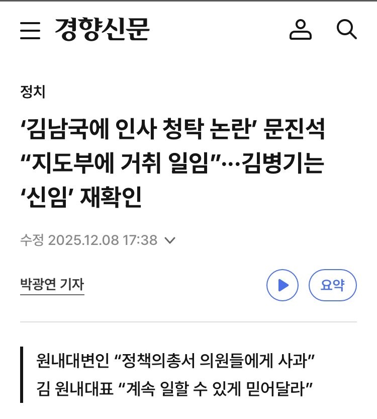 [기사] 인사 청탁 논란 문진석 “지도부에 거취 일임”, 김병기 신임