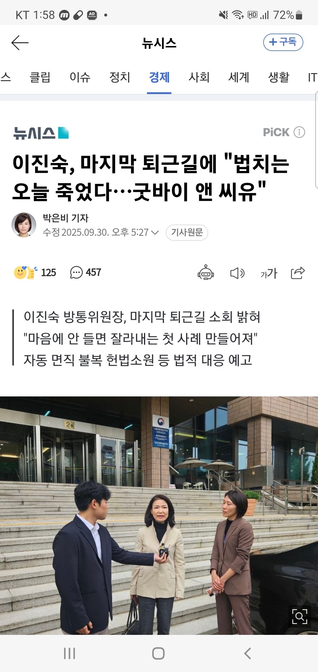 이진숙, 마지막 퇴근길에 "법치는 오늘 죽었다…굿바이 앤 씨유"