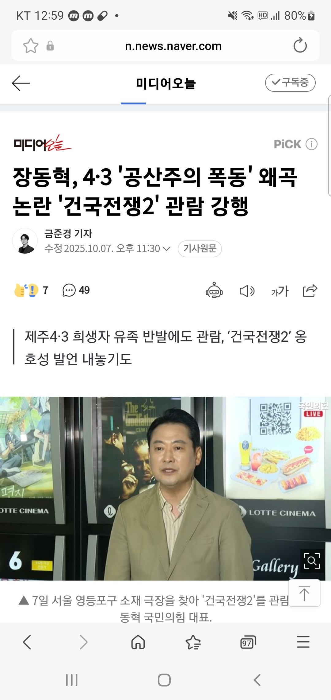장동혁, 4·3 '공산주의 폭동' 왜곡 논란 '건국전쟁2' 관람 강행