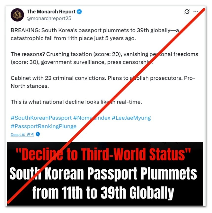 주로 극우 성향 뉴스를 확산시켜온 X(옛 트위터) 계정인 '모나크 리포트(The Monarch Report)'는 지난 14일 "속보: 한국 여권 순위, 전 세계 39위로 추락 - 불과 5년 전 11위에서 참담한 하락"이라는 내용을 글에서 그 원인이 "압도적 세금(점수: 20), 사라져가는 개인의 자유(점수: 30), 정부 감시, 언론 검열. 22건의 유죄 판결을 받은 내각. 검찰 폐지 계획. 친북 성향"이라고 주장했다.