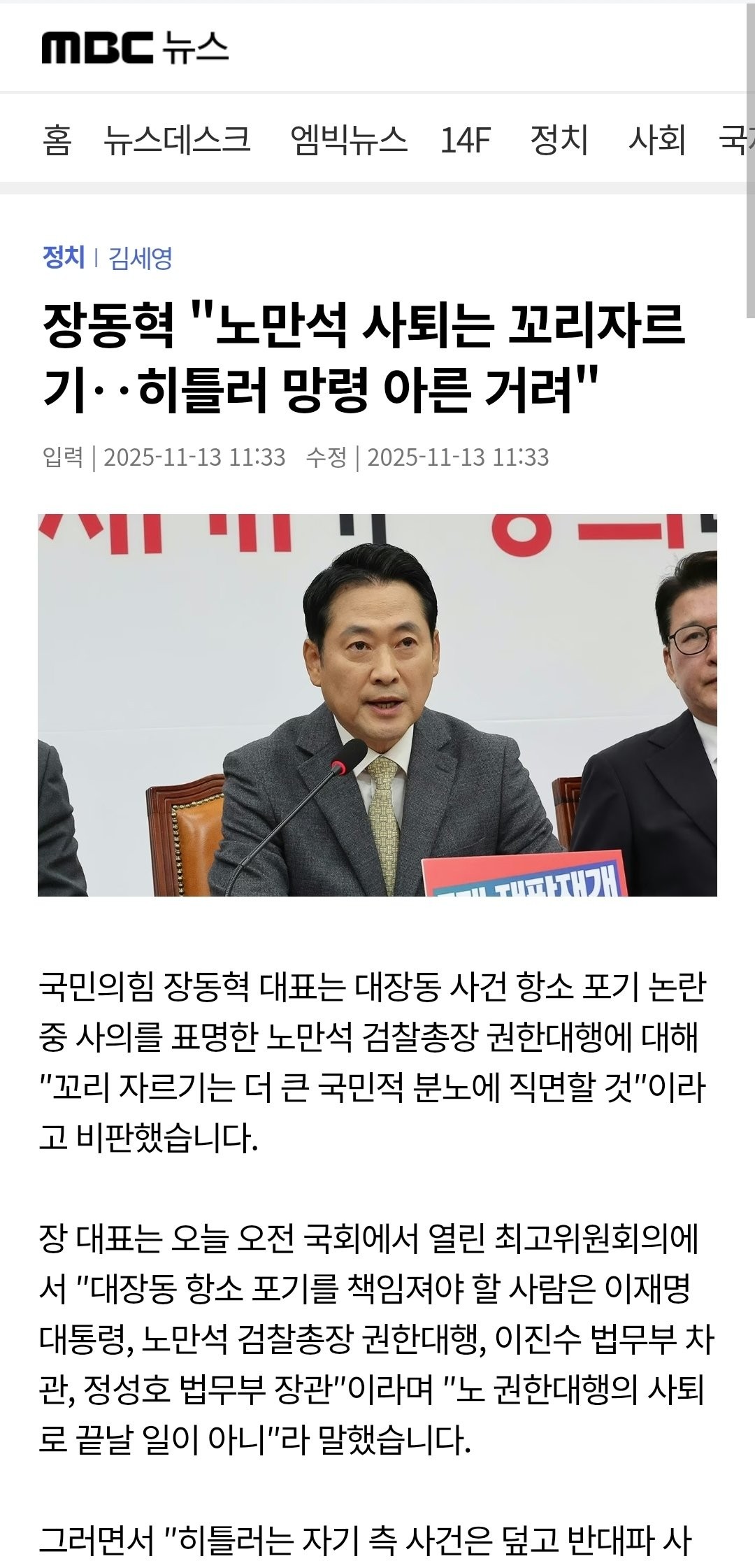 장동혁 "노만석 사퇴는 꼬리자르기‥히틀러 망령 아른 거려"