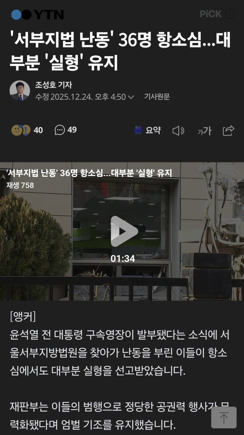 서부지법 폭동견 룬레반들 48명중 40명은 징역 1년에서 5년 나머지 8명은 징역형의 집행유예를 받았습니다. 다큐촬영을 간 정윤석 감독은 벌금 200만원이 선고됐습니다. 이들이 감옥에서 반성이나 하기나 기원합시다 갠적으로 형량이 너무 낮아서 아쉽