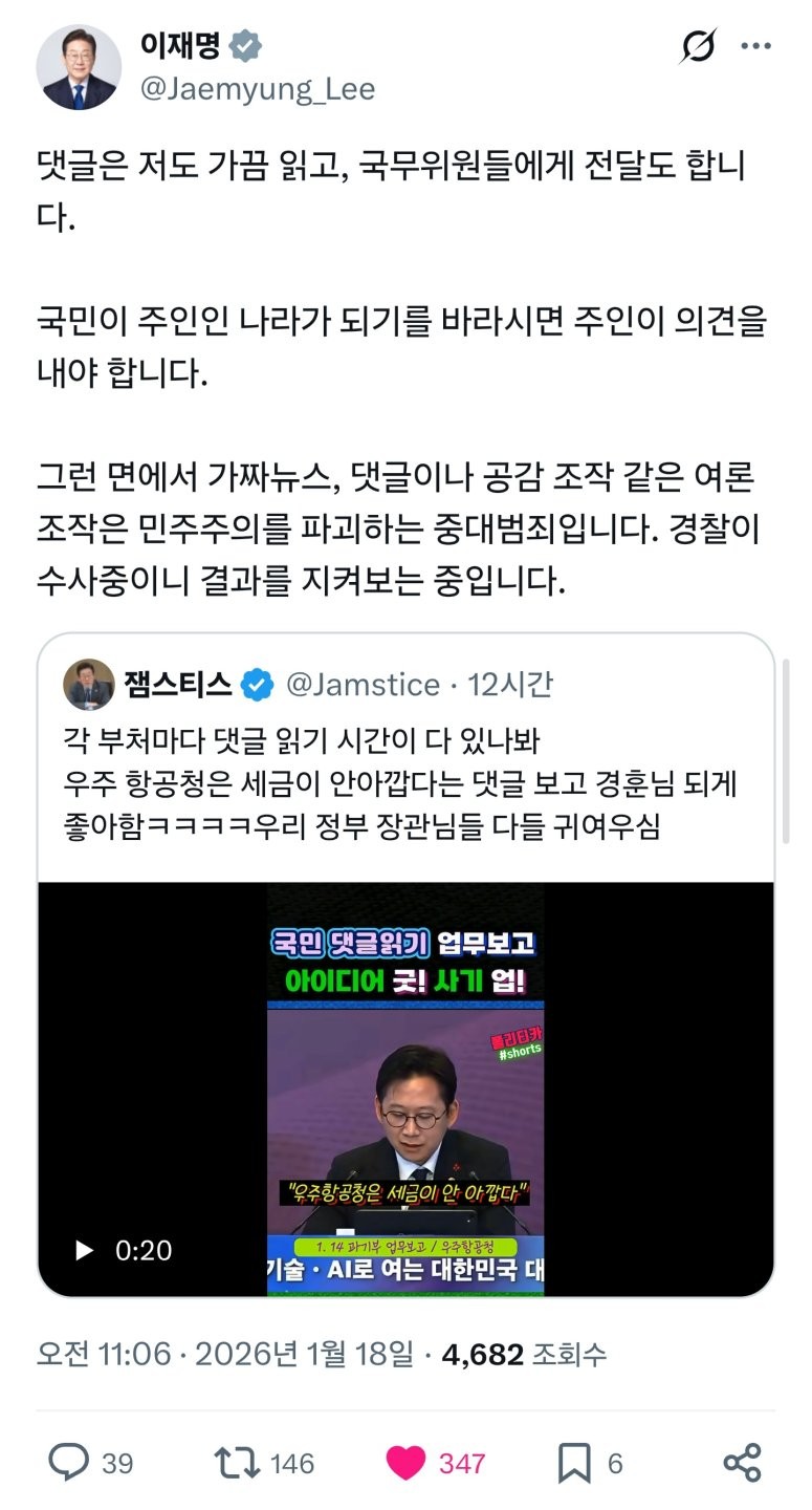 잼프가 댓글을 항상 보신답니다. 이럴땐 우리가 선플을 보내는게 필수지요. 그리고 가짜뉴스나 허위사실은 언제나 민주파출소로 보내면 됩니다.