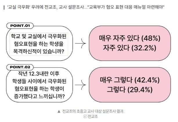 이 조사에서 '학교와 교실에서 극우화된 혐오 표현을 하는 학생을 목격한 적이 있느냐'란 물음에 '자주 있다'라고 답한 교사는 80.2%('매우 자주' 48.0%, '자주' 32.2%)였다. 이런 '극우화된 혐오 문제'가 '심각하다'라고 본 교사도 89.8%('매우 심각' 61.0%, '심각' 28.8%)에 이르렀다.