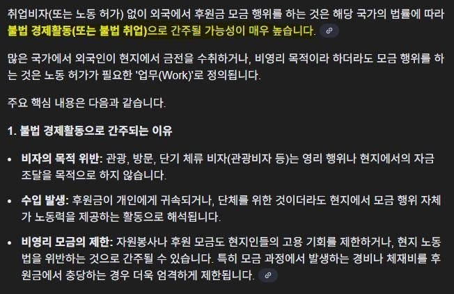 찾아보니 갔다는 국가들 전부 취업비자 없이 비영리 목적이라도 후원모금하는건 경제활동(Work)로 보고 법적 처벌을 받을수있다고 함.