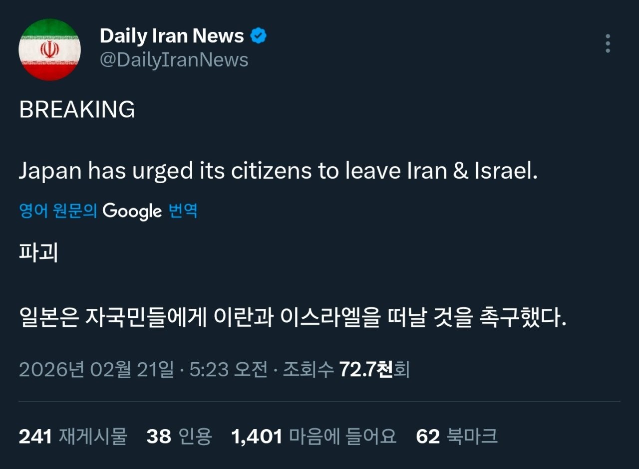 [속보] 일본외무부 "지금 당장 이란 이스라엘서 출국하길"