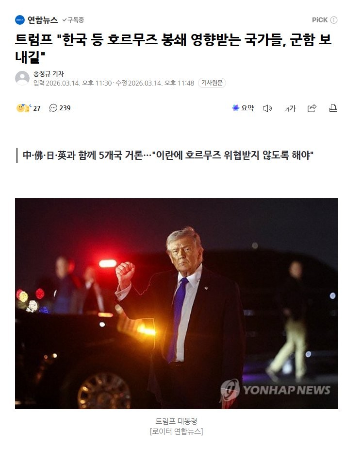 [긴급] 트럼프 "한국 등 호르무즈 봉쇄 영향받는 국가들, 군함 보내길"