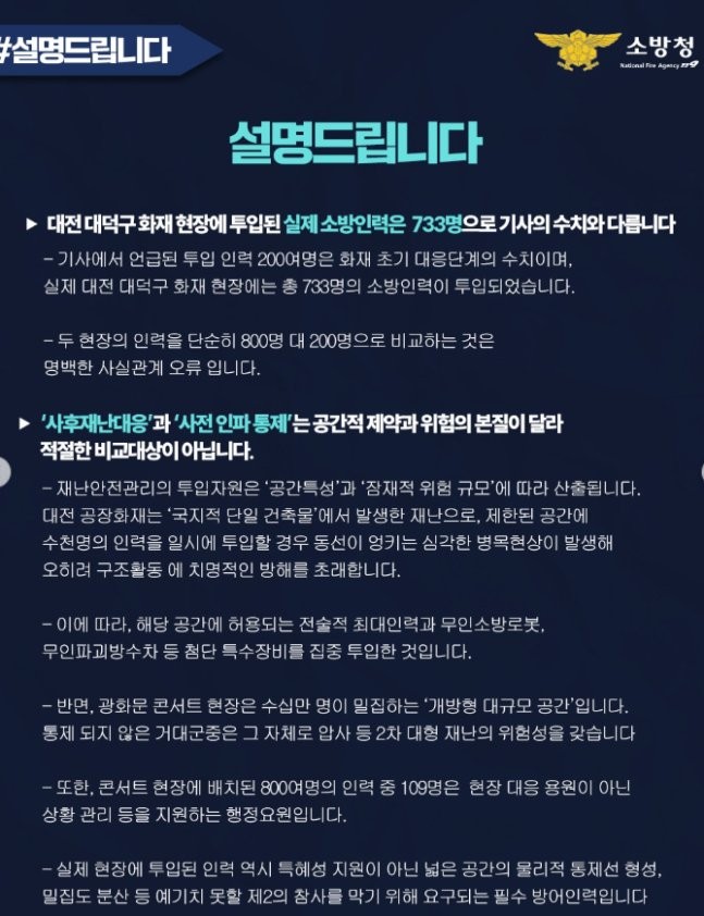 또한 “실제 현장에 투입된 인력 역시 특혜성 지원이 아닌 넓은 공간의 물리적 동제선 형성, 밀집도 분산 등 예기치 못한 제2의 참사를 막기 위해 요구되는 필수 방어인력”이라고 설명하며 끝으로 “대전 공장화재 수습에 최선을 다하고 대규모 인파 밀집 행사장의 선제적 안전관리에도 국가의 당연한 책무를 흔들림 없이 수행할 것”이라고 말했다.