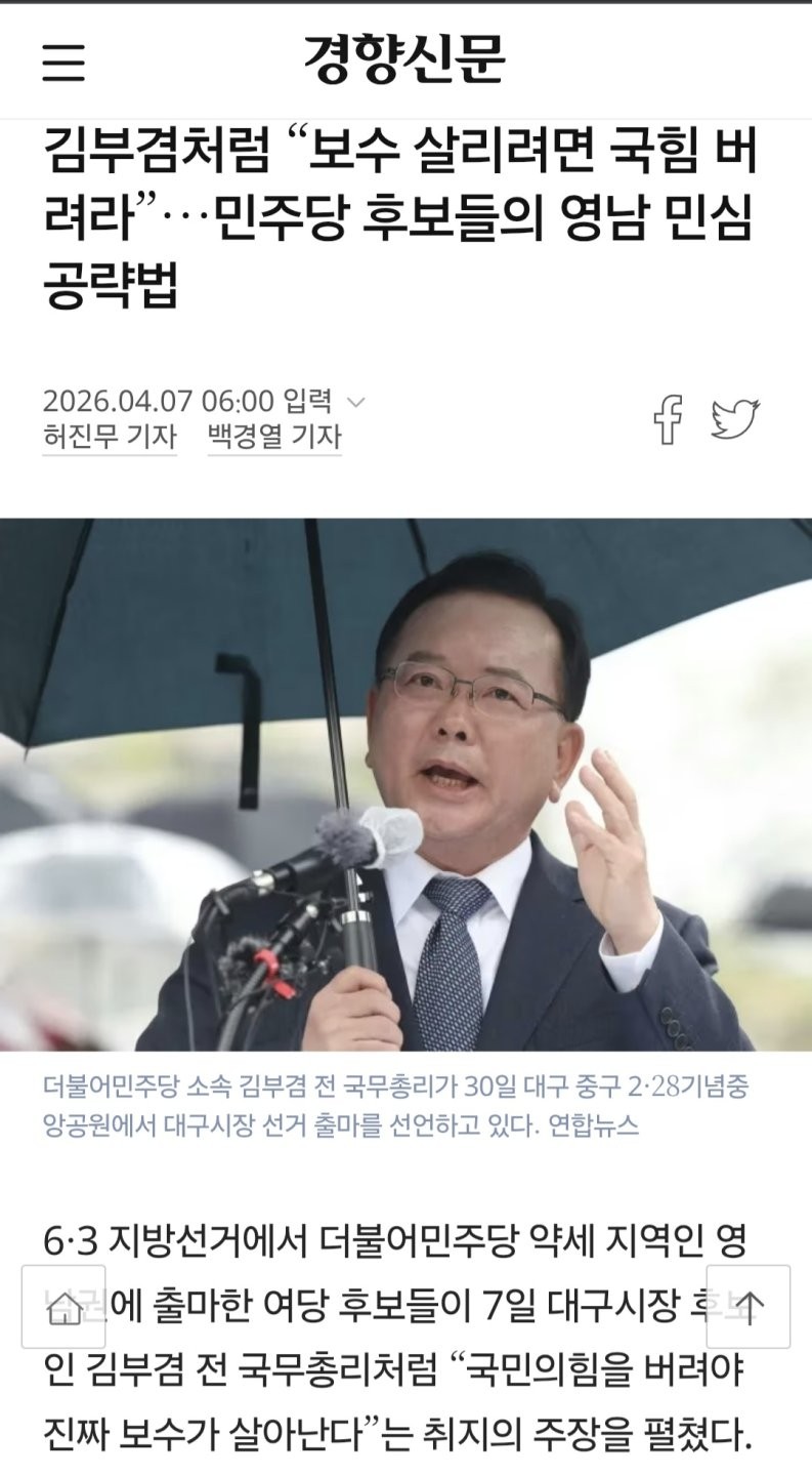 김부겸처럼 “보수 살리려면 국힘 버려라”…민주당 후보들의 영남 민심 공략