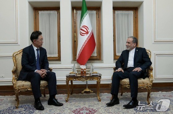 이란에 파견된 정병하 외교부 장관 특사와 압바스 아그라치 이란 외무장관.(파르스통신 소셜미디어 엑스 @FarsNews_Agency)