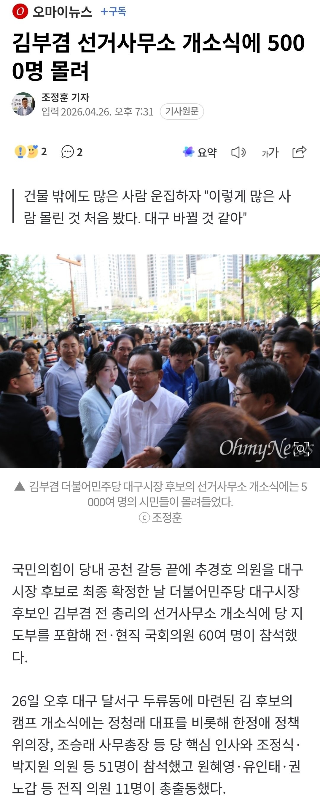 시작부터 분위기가 좋네요. 대구시민들도 변화를 바라는 열기가 좋아요. 이번에는 진짜로 될거같습니다.